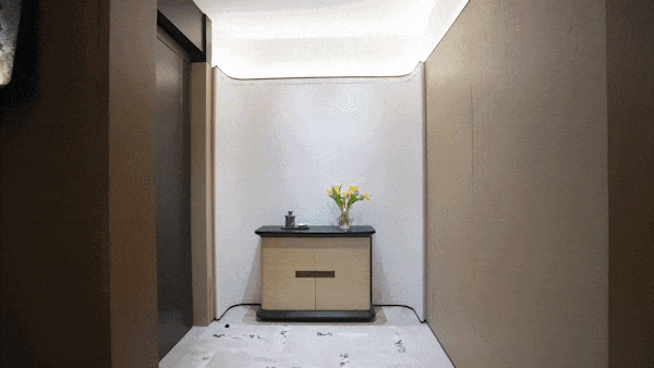 该户型纵享一梯一户,电梯厅的设置装备摆设。电梯门的刹那,即是家的范畴。这道专属缓冲带,让归家成为从喧哗到的文雅过渡,感从踏入门前便起头累积。并且这个空间的拆标也常精美的,1。7米双扇铸铝门,搭配宝格丽石材取灰拼花,延长至电梯厅。皇家白玉石玄关,兼具储物取展现功能,质感温润。